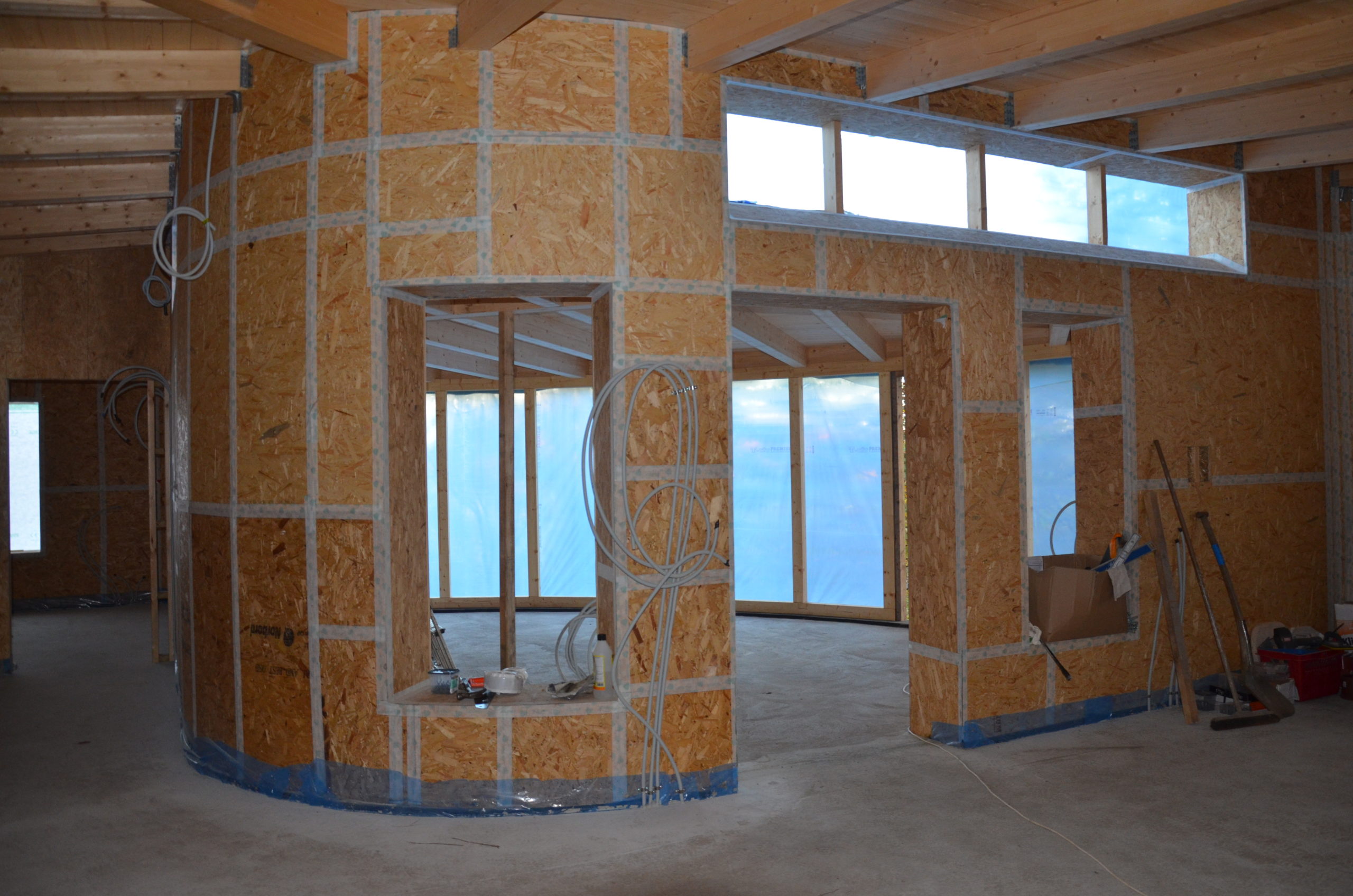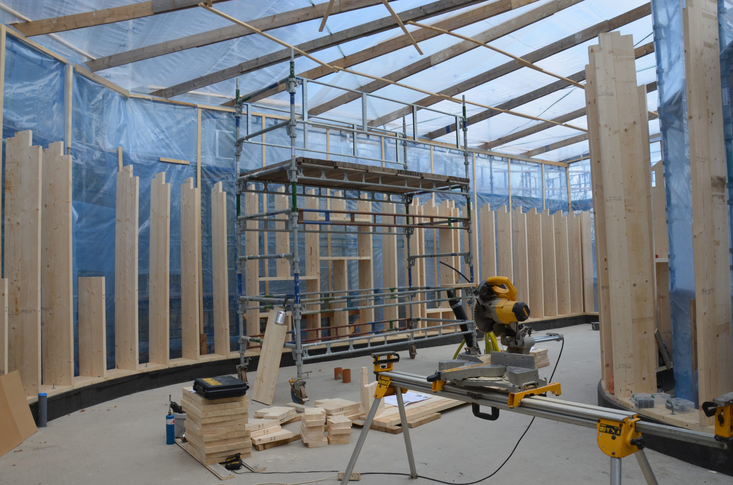 Planeringen av byggnaden och dess organisation gestaltades så att nästan alla arbeten dvs. hela byggnaden har kunnat utföras av en man. Dessutom sattes ett väderskydd upp både för att skydda byggmaterialen mot väder och vind men även för att säkerställa en torr, varm och ren byggarbetsplats för byggarbetaren.