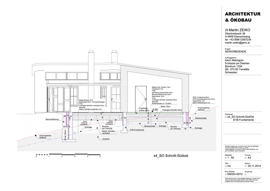 141104_007d _50_Fund. s4_SO_Schnitt-SudOst_smallKursen är uppdelad i olika delar. Första dagen handlar om energieffektivt byggande och passivhusstandard. Följande dagar handlar om ekobygge i allmänhet och planering och byggande av ett halmbalshus i nollenergistandard i synnerhet. Kursinnehållet Byggelement och Att bygga i praktiken undervisas direkt på byggarbetsplatsen. Martin Zeiko preciserar husets olika delar. Kursen avslutas med en workshop då du får möjlighet att prova på att bygga med halmbalar. Sedan är det bara att åka hem och börja planera ditt eget husbygge eller dela med dig av kunskapen till dina arbetskollegor.